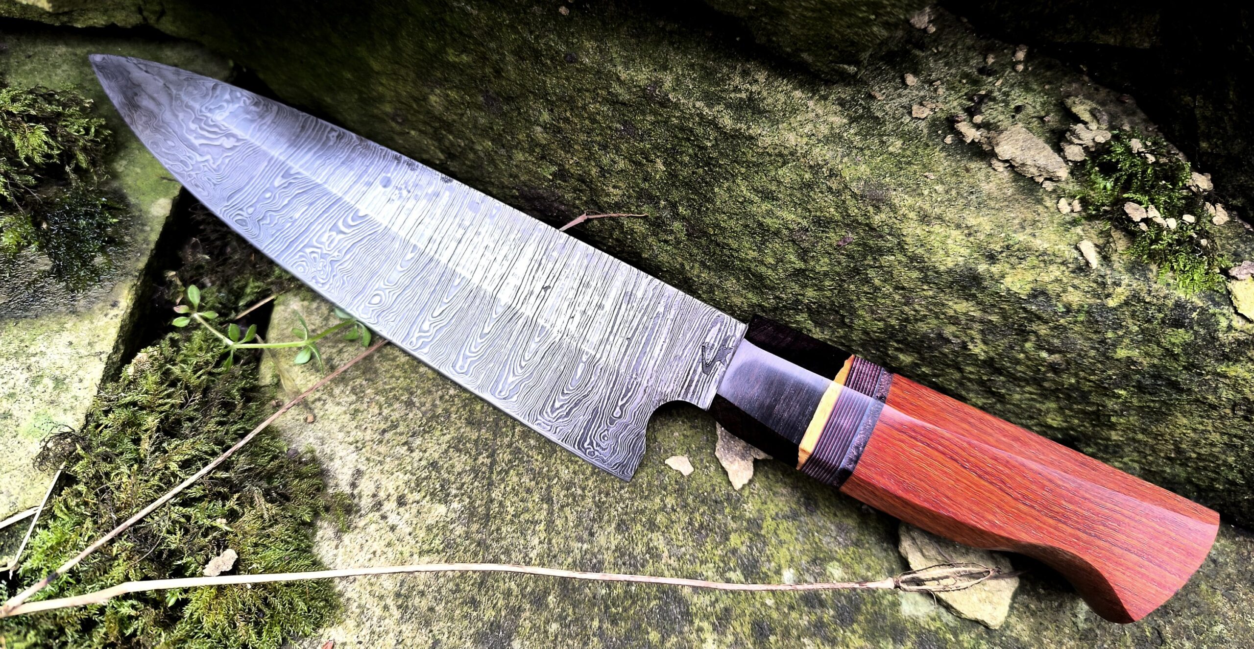 Hand forged damascus steel western style chef knife by Dr Zech featuring 256 true layers. This blade shape is a perfect choice for cutting most vegetables, beef, and chicken.