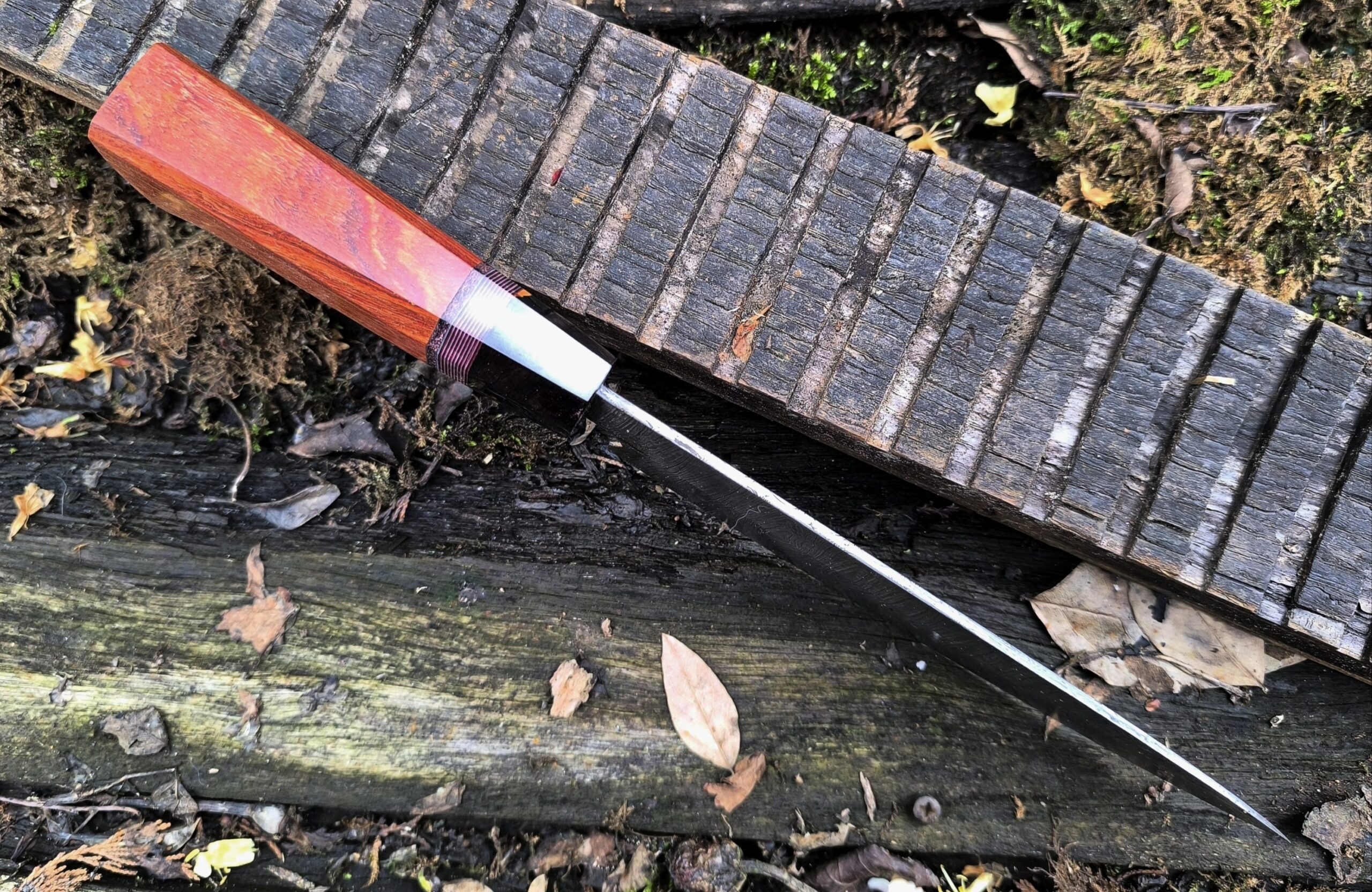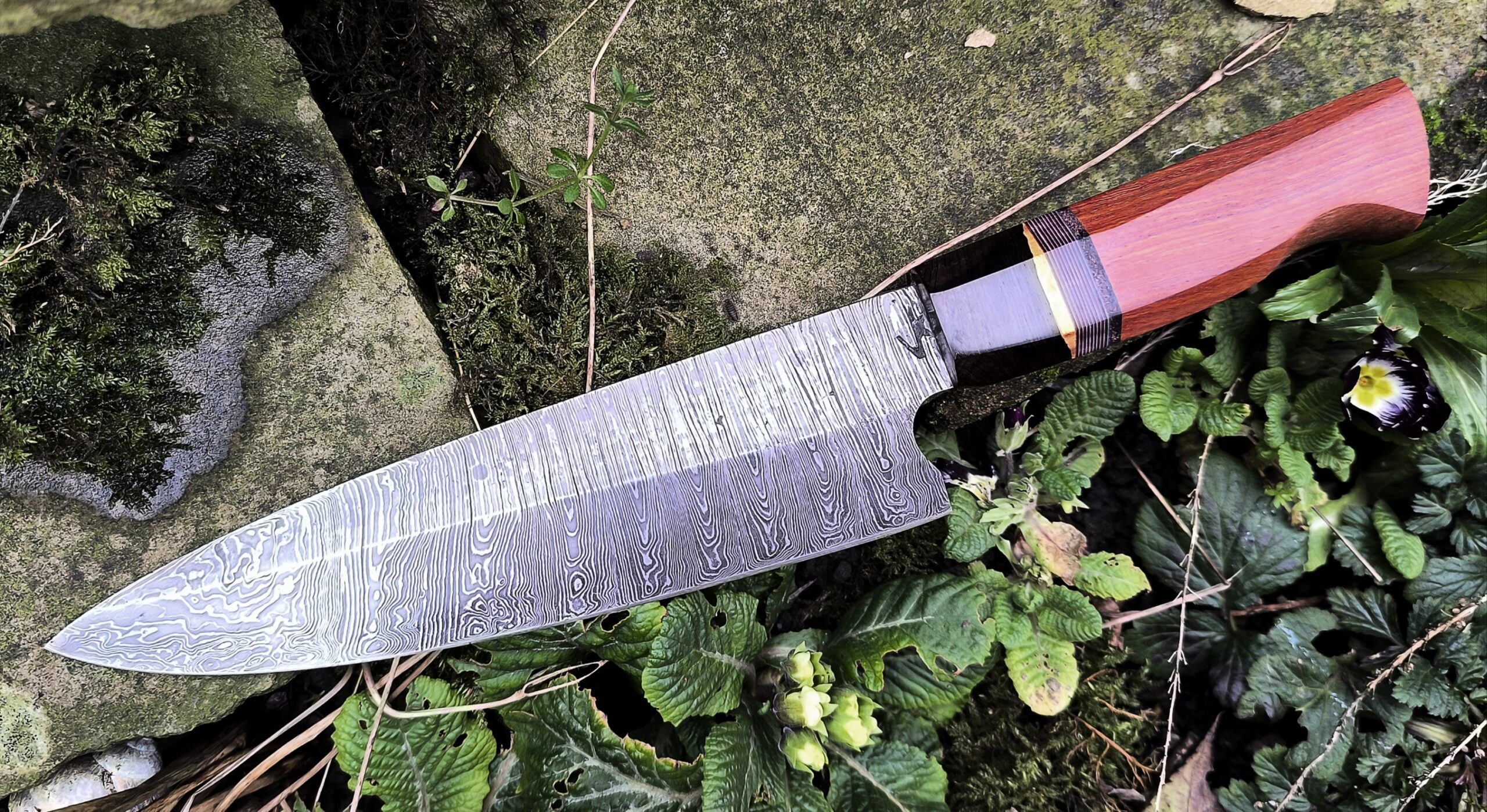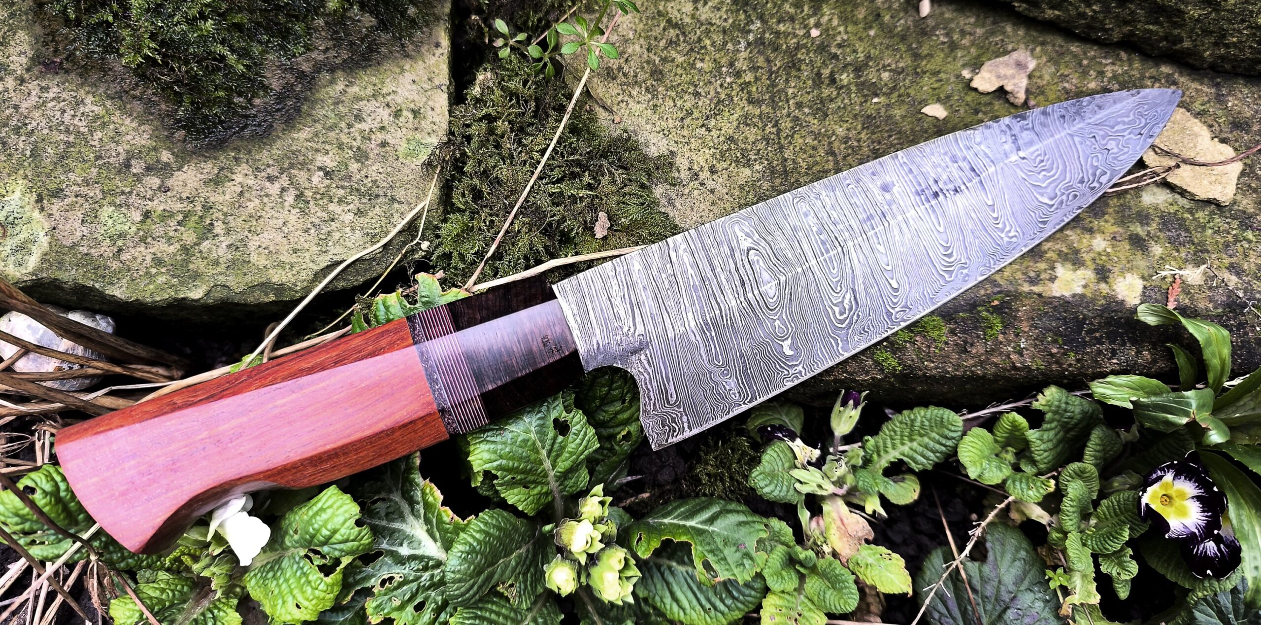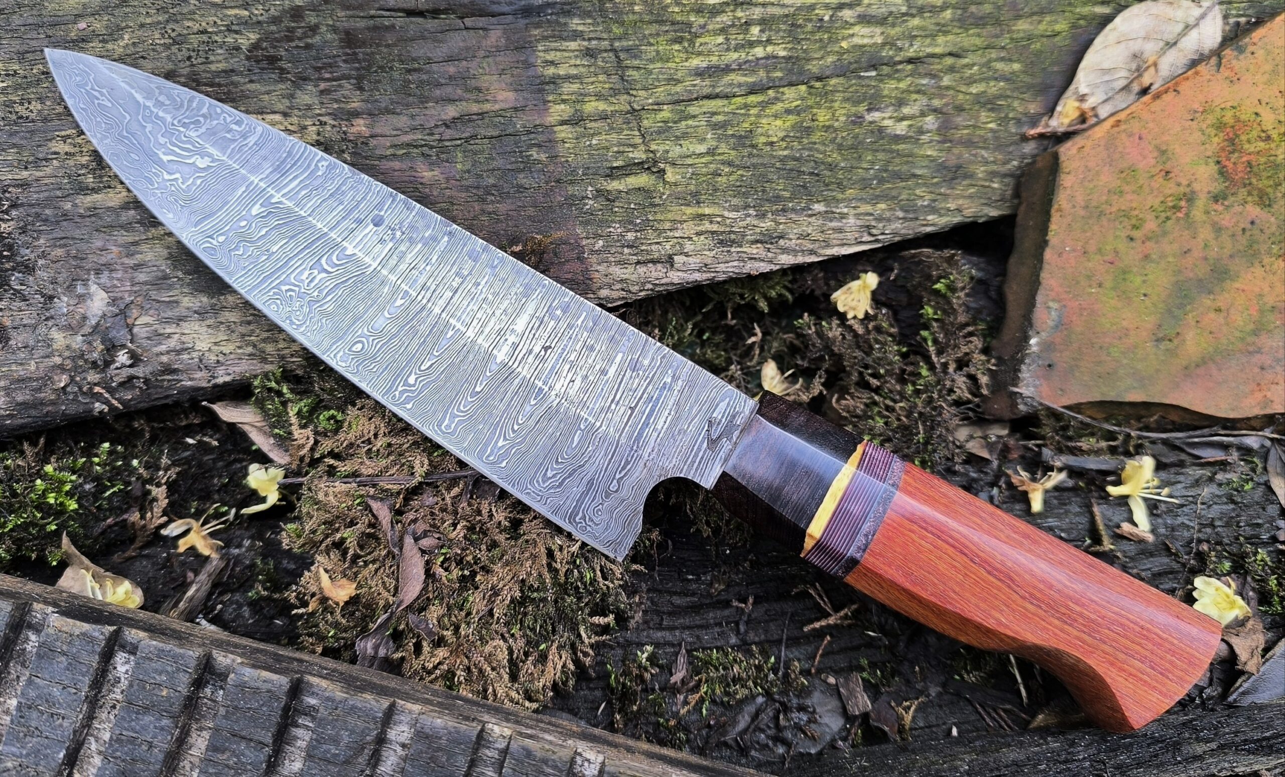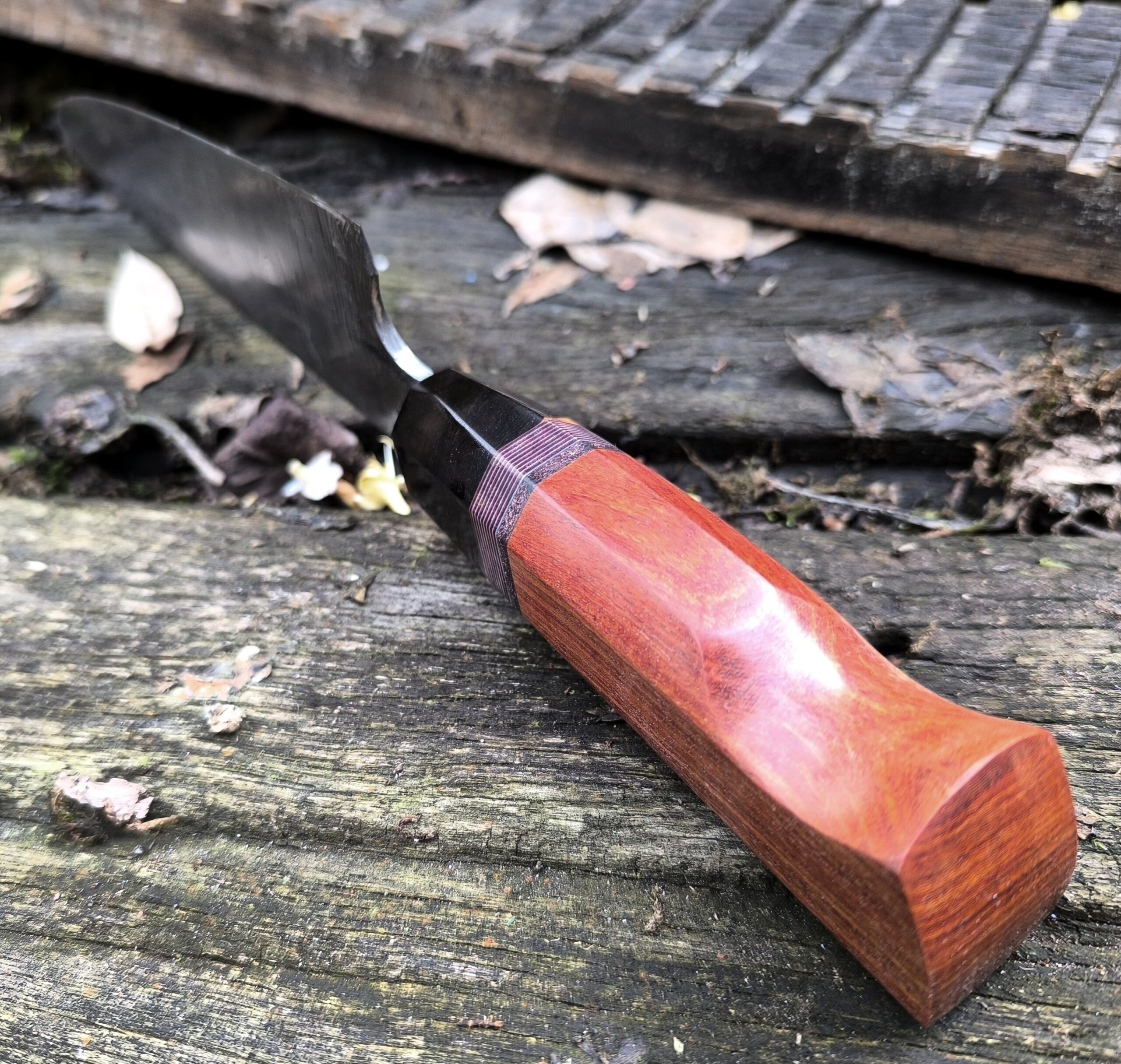 The handle on this hand forged chef knife includes an African blackwood cap followed by micarta, leather and finished with Pau Rosa wood.