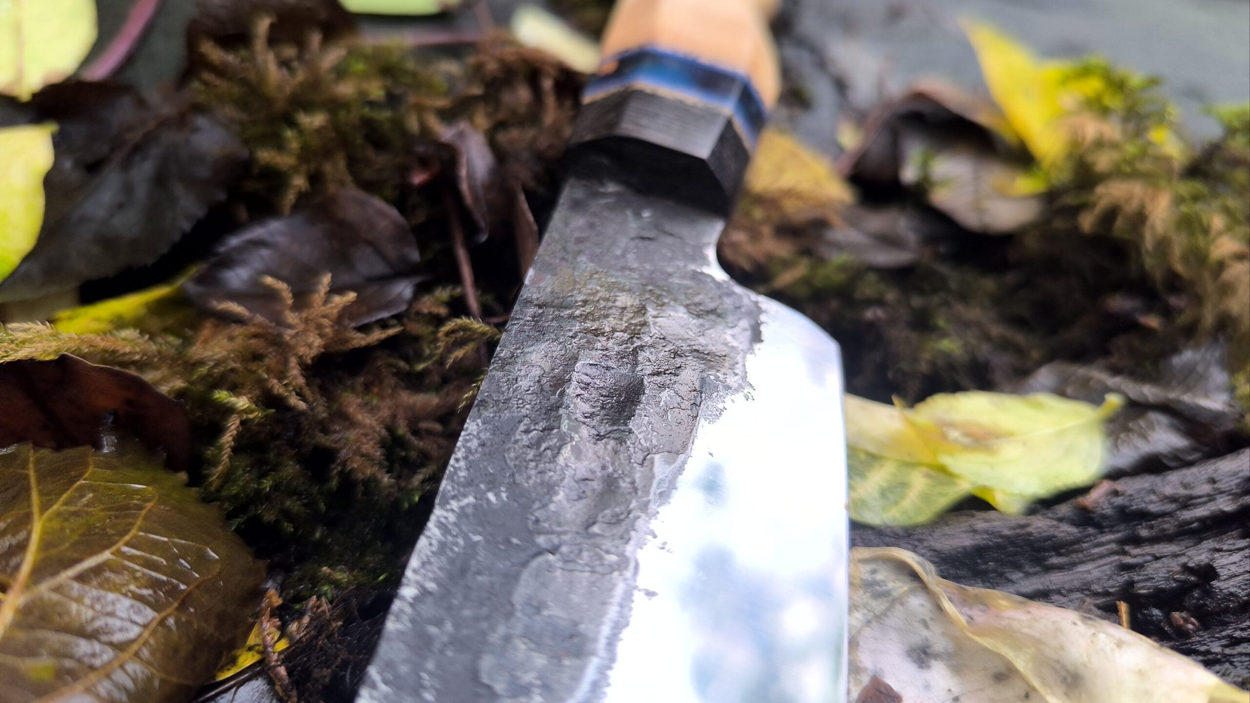 The blade bevel is highly polished and the spine features a deep naturally hammered finish.