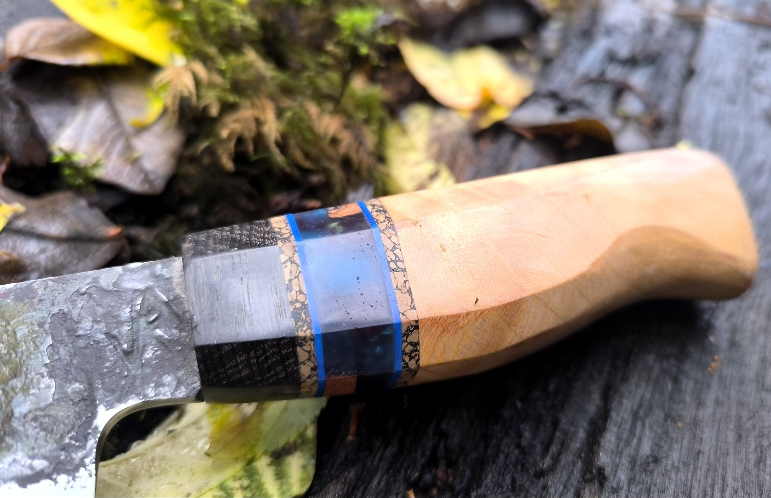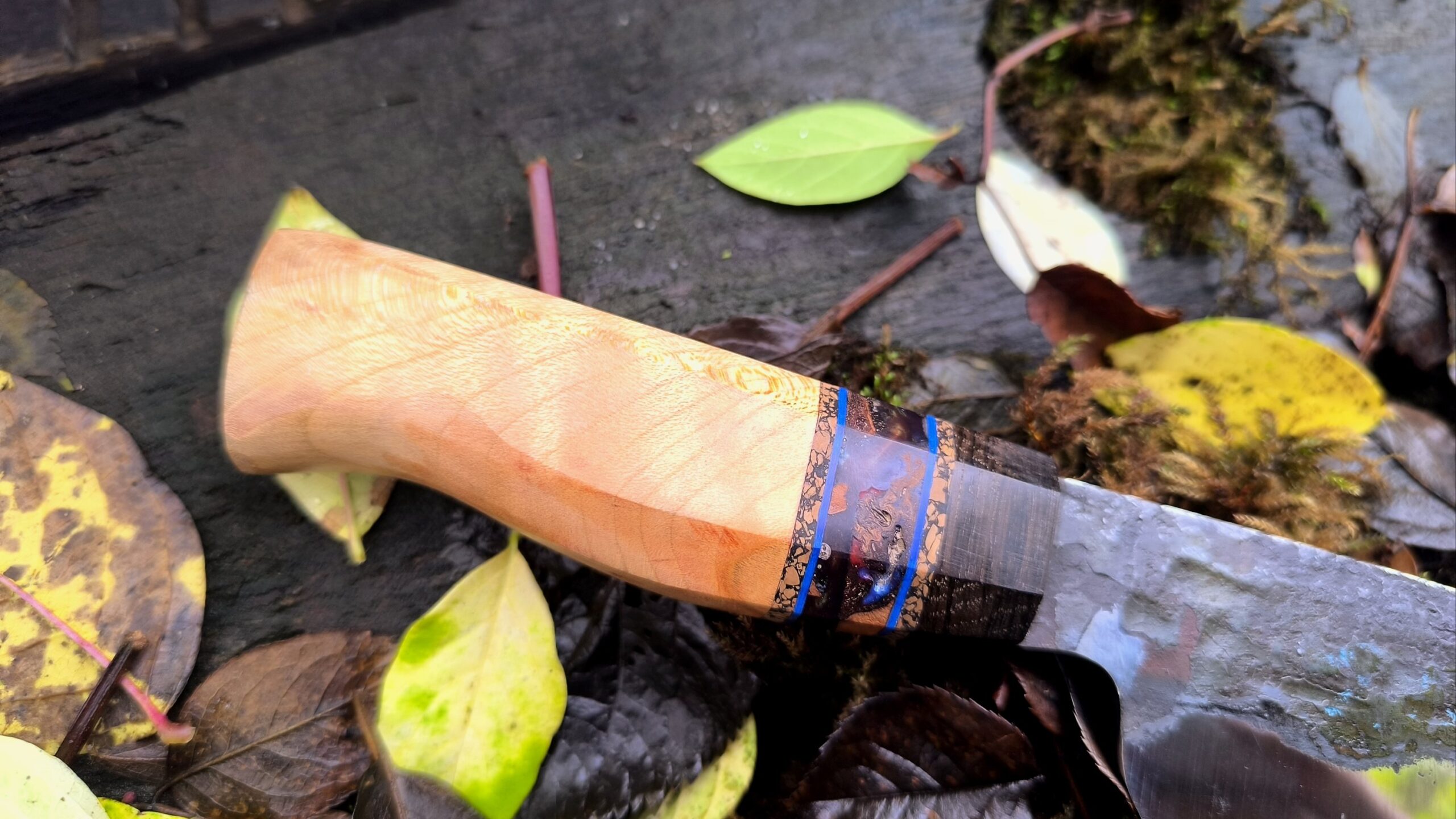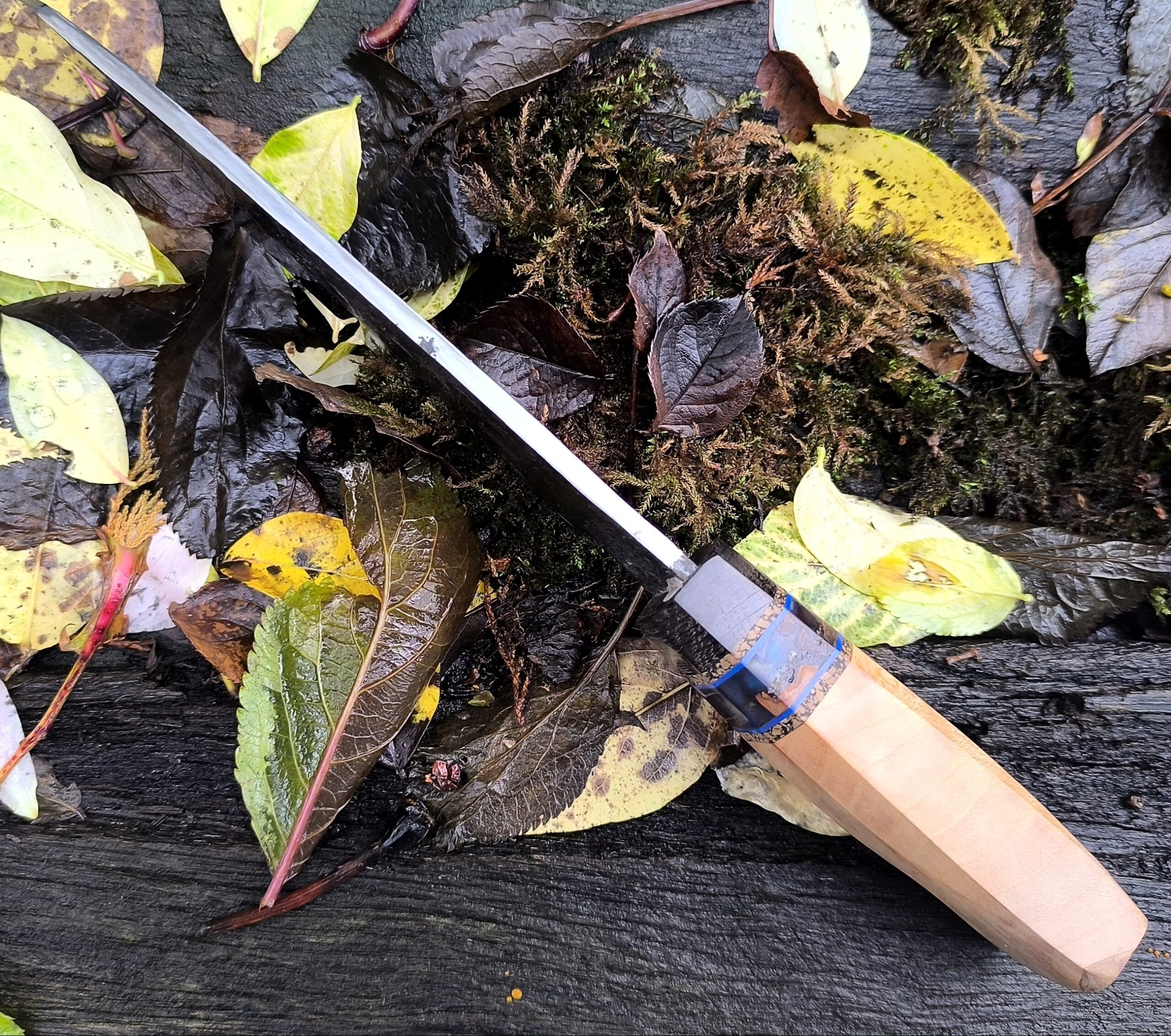 The handle is a modification of a traditional Japanese octagonal handle and is made of English fruiting cherry with burl and resin spacer and bog oak cap. The bog oak is from the Fens and dated to c.3300BP.